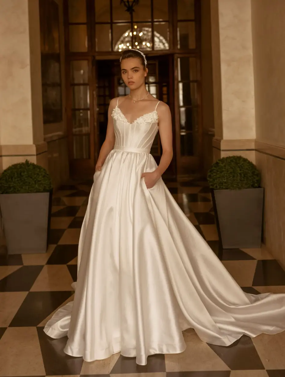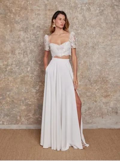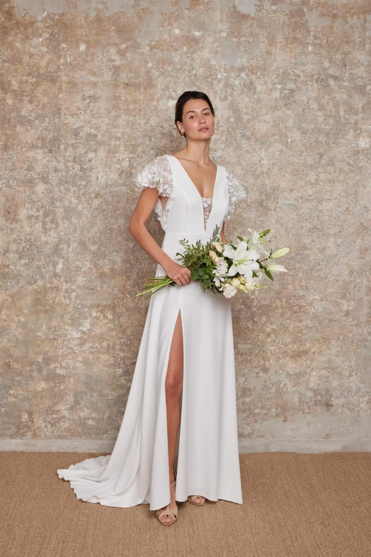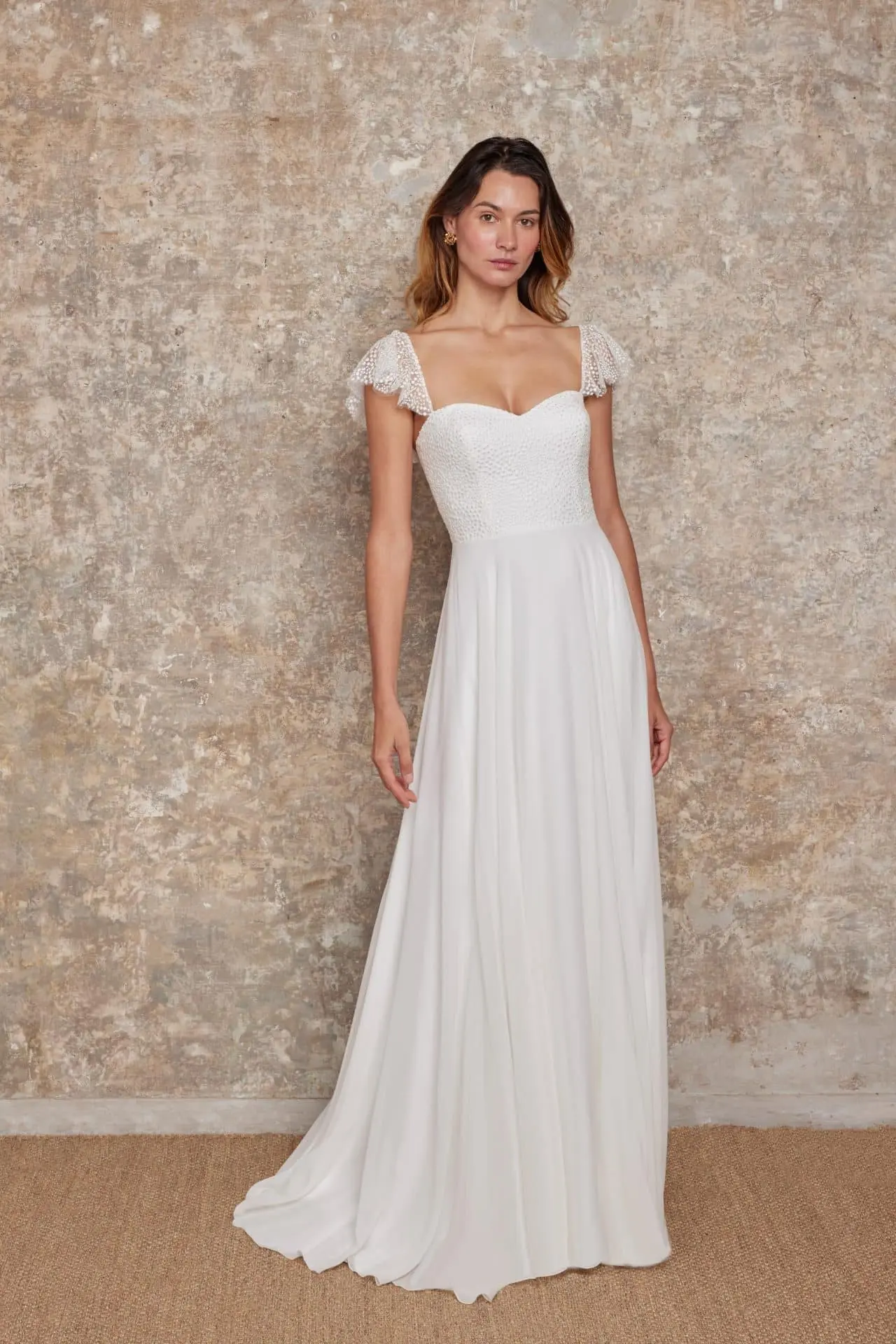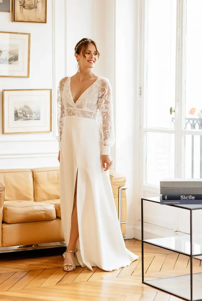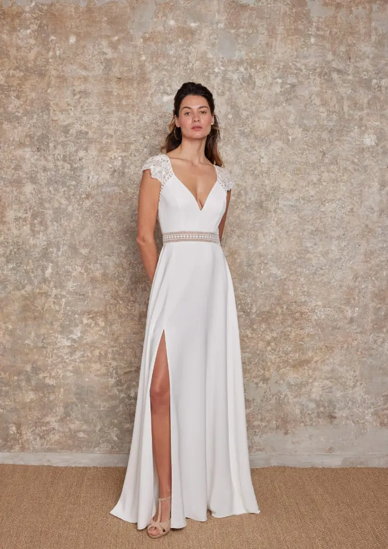 Les modèles correspondent aux mariées d’aujourd’hui et dans l’air du temps : bohème, classique mais aussi pleins de poésie, tous ces modèles sont inspirés de l’air du temps avec ces mélanges de tissus, plumetis et dentelles épurées.