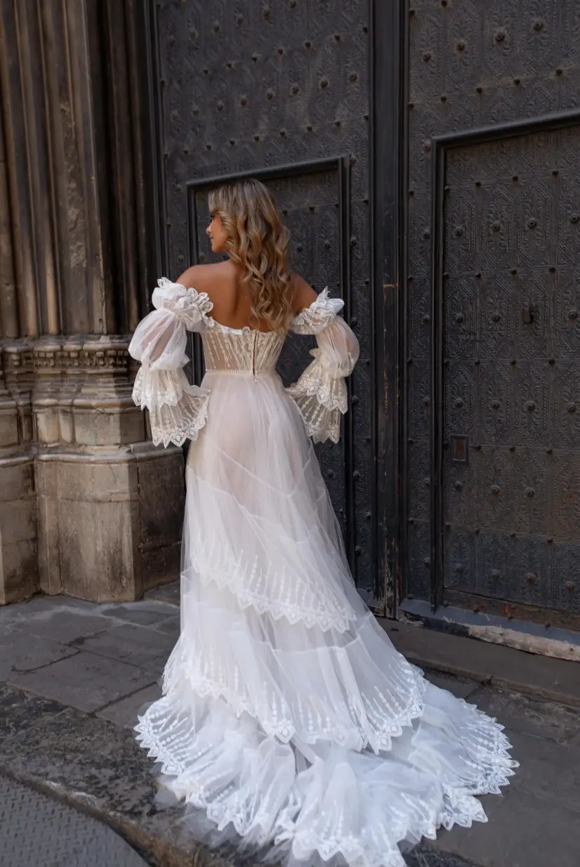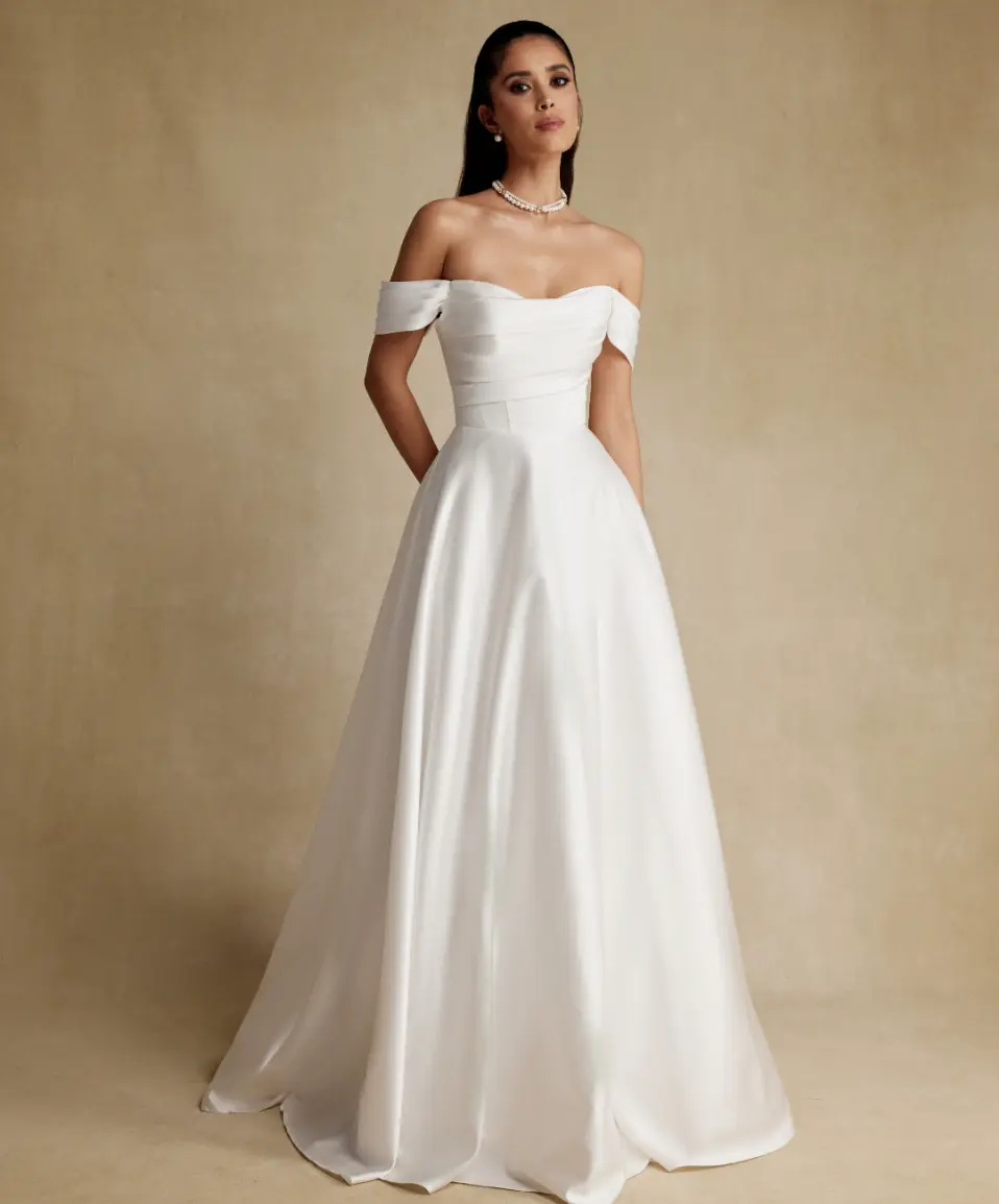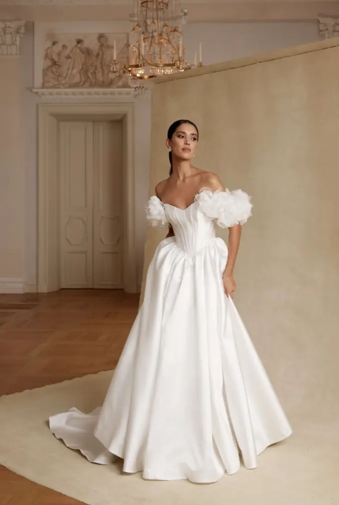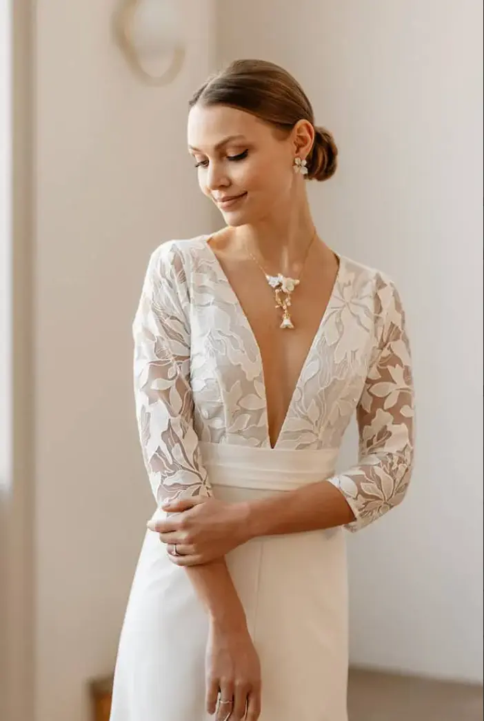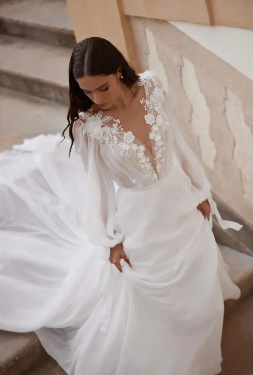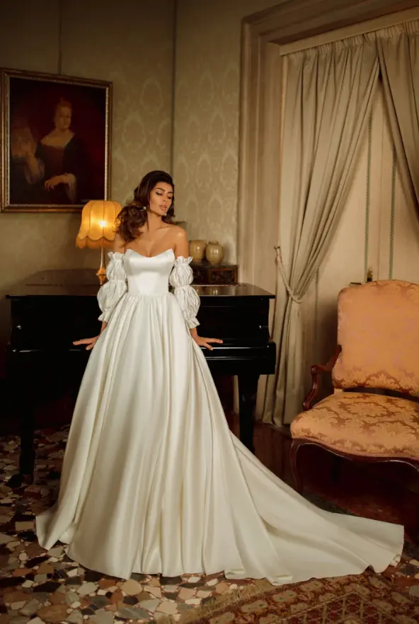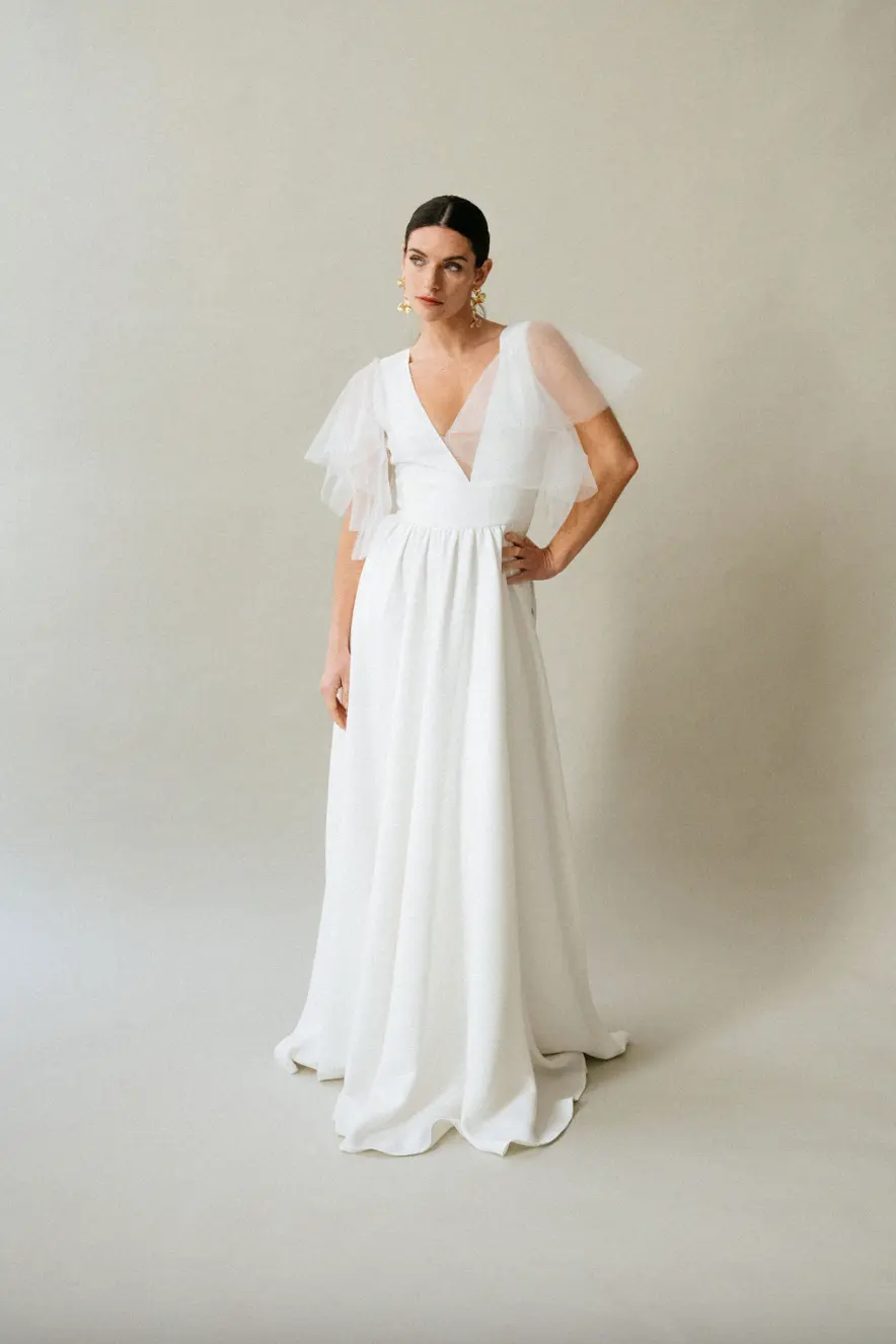 Les modèles correspondent aux mariées d’aujourd’hui et dans l’air du temps : bohème, classique mais aussi pleins de poésie, tous ces modèles sont inspirés de l’air du temps avec ces mélanges de tissus, plumetis et dentelles épurées.